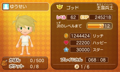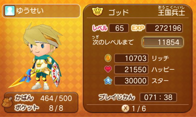 3390 : 新入りです。一年位前に全ゴッド&200lvまで頑張ったのですが、データが消えてしまって、悲しみで当分ファンタジーライフやってませんでした。 最近またやり始めて、現在は42lv(?)の狩人です。 誰か通信しようぜ!! フレコは 0877-0148-1788 です。 名前は上記と同じです。 よろー。 |