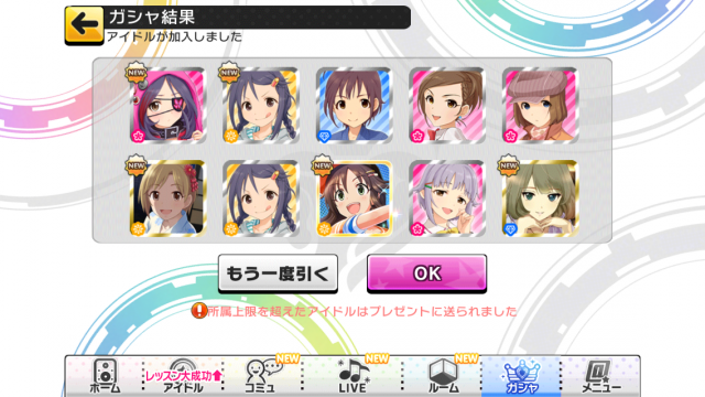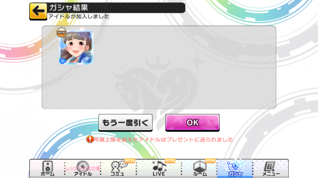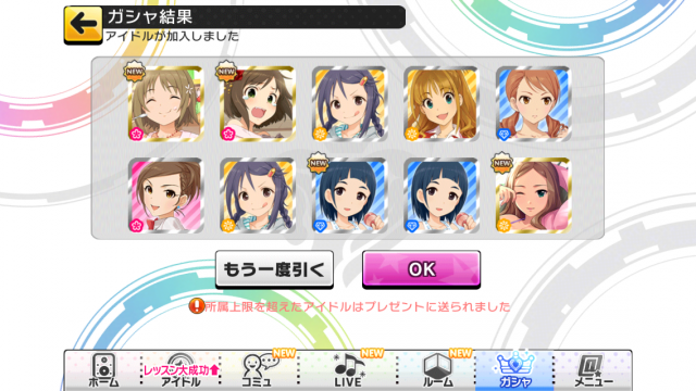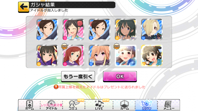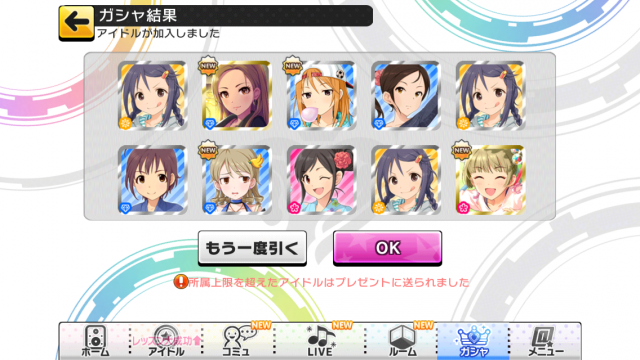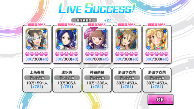 20 : >>19 お疲れ様でした~ このゲームはとりあえずLIVEやっておけばいいゲームなので慣れれば楽しめるはずですw イベントは1か月に2~3回あるので初心者の方でもすぐにイベントSRアイドルが取れるとおもいますからゆっくり遊んでも大丈夫ですよ! |