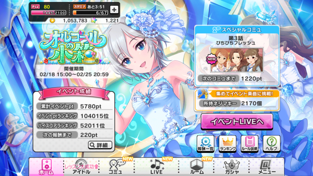 18 : イベント「LIVE Groove Visual burst(Tulip)」終了しました! みなさんはアイドルをゲットできたでしょうか? なにはともあれお疲れ様でした! ~次回イベントのお知らせ~ 「シンデレラキャラバン」の開催が決定です! 期間中はLIVEで特定のSRアイドル、Rアイドルがドロップします また「キャラバンメダル」というアイテムもドロップし、こちらは回数限定でアイドルやアイテム、ジュエルなどとも交換することができます 開催予定時刻は2月10日15時からです!皆さま、奮ってご参加ください! |
