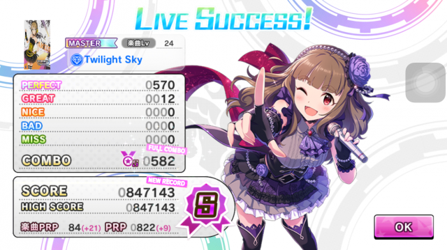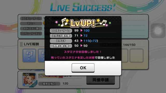 1941 : 同時にレベル100になりました 100になる瞬間は絶対にトワスカフルコンで!と決めていた トワスカはデレマスで一番最初に大好きになった曲だし思い入れも強かったから。何故か26以下(つぼみ除く)でこれだけフルコンできないでいた 80プレイ目にてようやくフルコンだけど100になるのに合わせるためにリタイアしまくったから実質110回以上はやってる 79回目からスタートして石350個程と貯めてたスタドリ全部だから、リタイアしてなければかなりのエンブレムが稼げてたと思うけどまあよかった