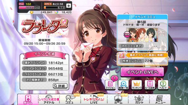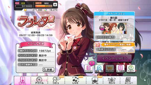 1924 : 咲いてジュエルイベの時にボーダー落ちしかけたの思い出して寒気がしてきた 新曲+人気のアイドル(上位報酬がシンデレラガール)+アタポン式とボーダーが高くなる条件が揃いに揃ってるから恐ろしい |