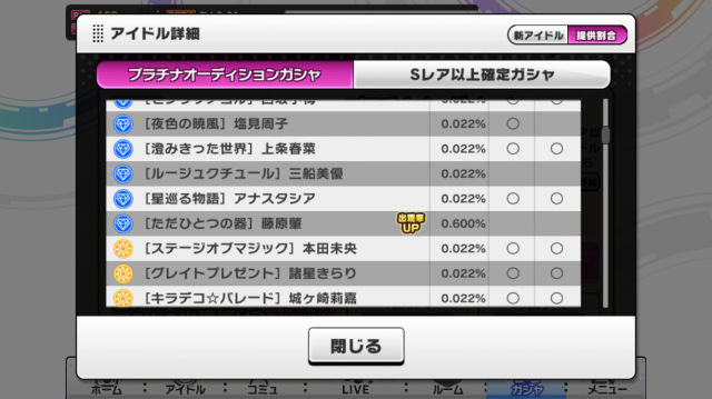 2159 : 俺もグルーブは全声ありアイドル使って欲しいから続けて欲しいなぁ アタポンとパレードでアニメ曲をどんどん実装して欲しい |