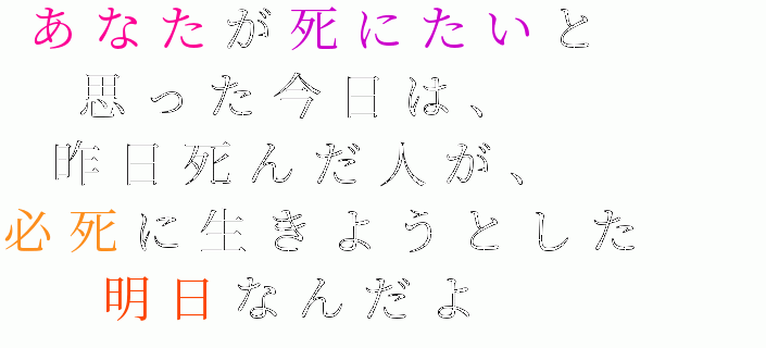 946 : >>930 あなたが死にたいと、 思った今日は 昨日死んだ人が、 必死に生きようとした 明日なんだよ |
