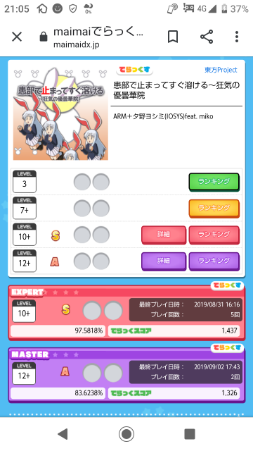 19 : >>18 全部ちょっとずつ順位下がってて萎える。 ちなみにチュウニズムやってなさすぎてレート0.66だったの吹きましたわ EXPERTは一応クリアできるレベルだったから気長にやります オンゲキは席が空いてない。 |