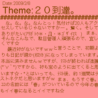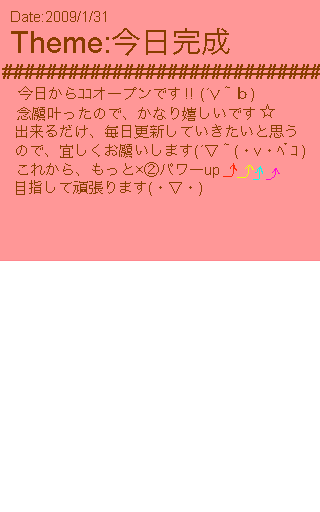 やったよぉっ 頑張れって 言えたよぉ ほんとにうれしいことがいっぱいだった☆ 明日は少しでもいっぱい好きな人と話せるように頑張ります! |